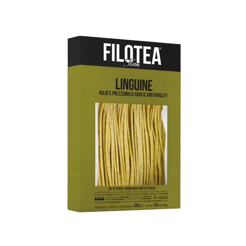 Filotea volgde de eeuwenoude traditie van eierpasta volgens het Marche-recept , van de selectie van de beste grondstoffen tot het langzame en geduldige drogen. Dankzij de brons persing heeft deze pasta zeer poreus oppervlak en een uitstekend vermogen om de saus vast te houden. Bij deze linguine met scharrel ei zijn kleine stukjes look en peterselie verwerkt in het deeg.